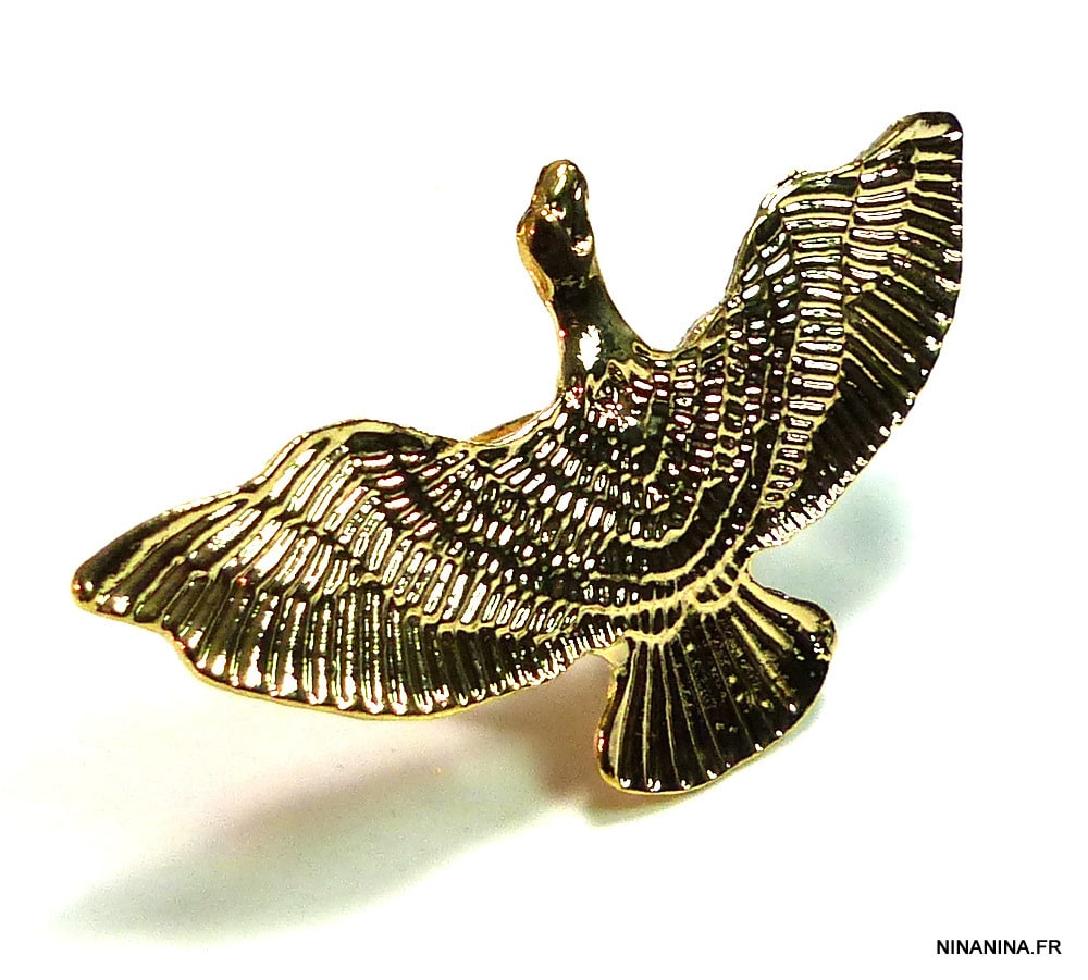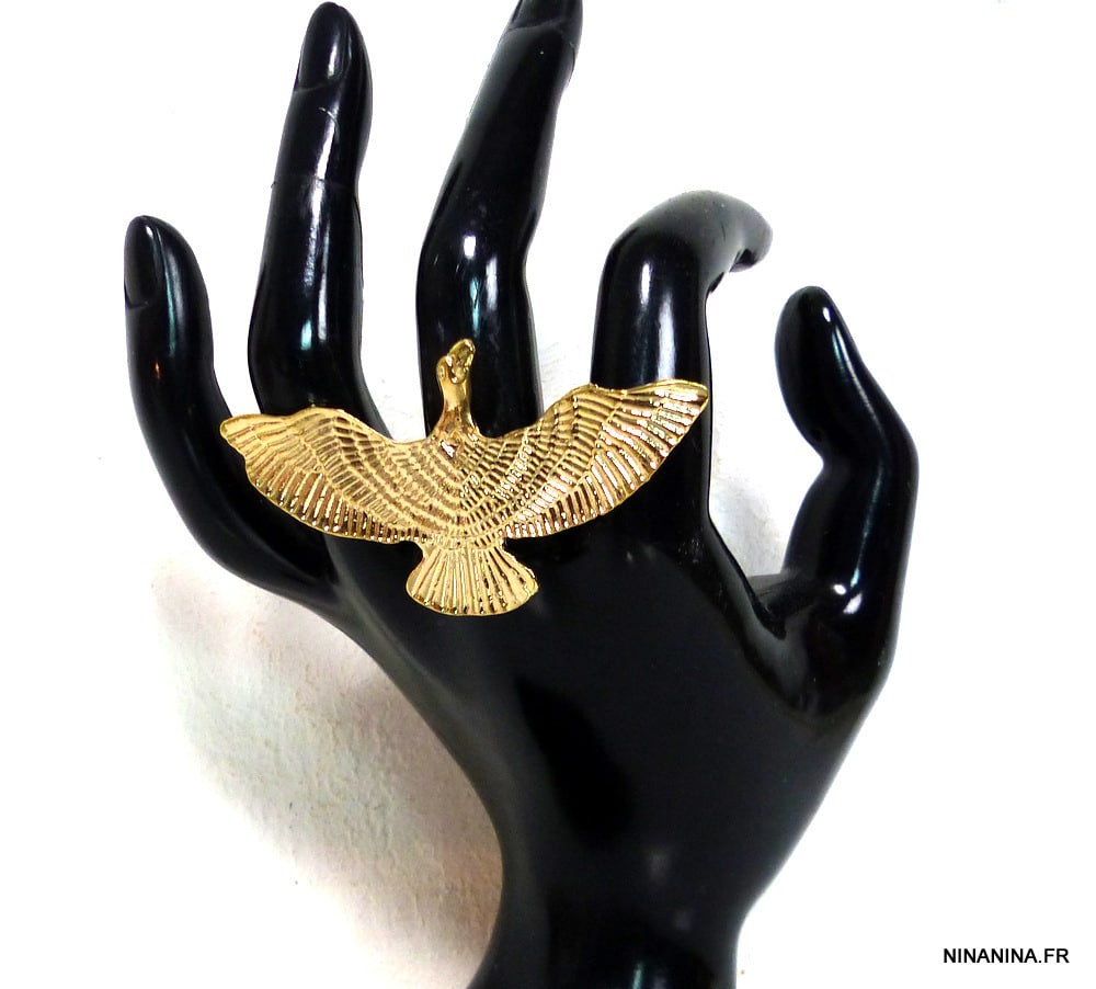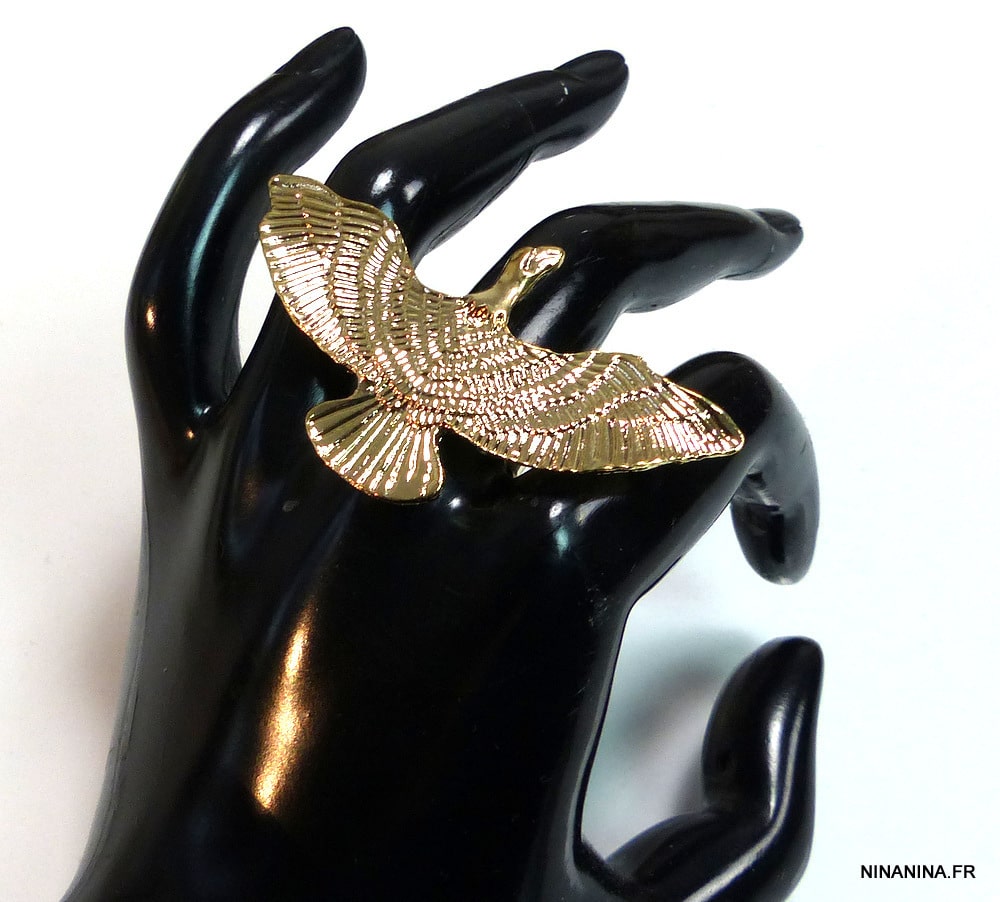 Bague ethnique oiseau métal doré. Largeur : 6 cm. Hauteur : 3,5 cm. Diamètre ajustable : 1,7 cm environ. Livré dans sa pochette d’organza. Bijou 100% fait-main.