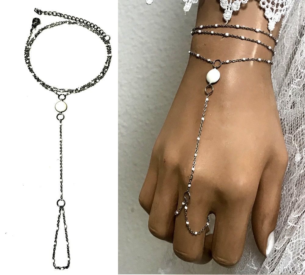 Délicat et raffiné, ce Bracelet avec doigt perle blanche acier inoxydable argent composé de mini perles blanches et d’un motif rond en acier émaillé blanc répartis sur une fine chaine, formant un bracelet relié à une chainette formant la bague, délivre toute sa finesse, et vous fera tout simplement craquer!