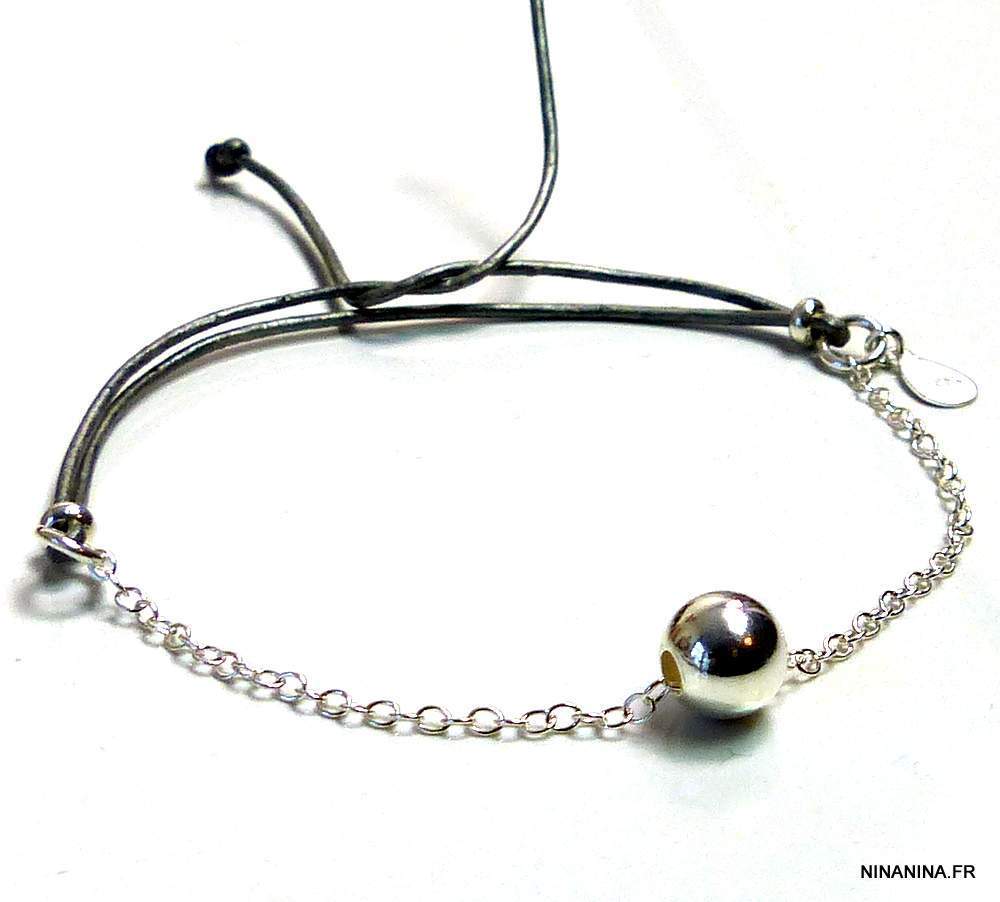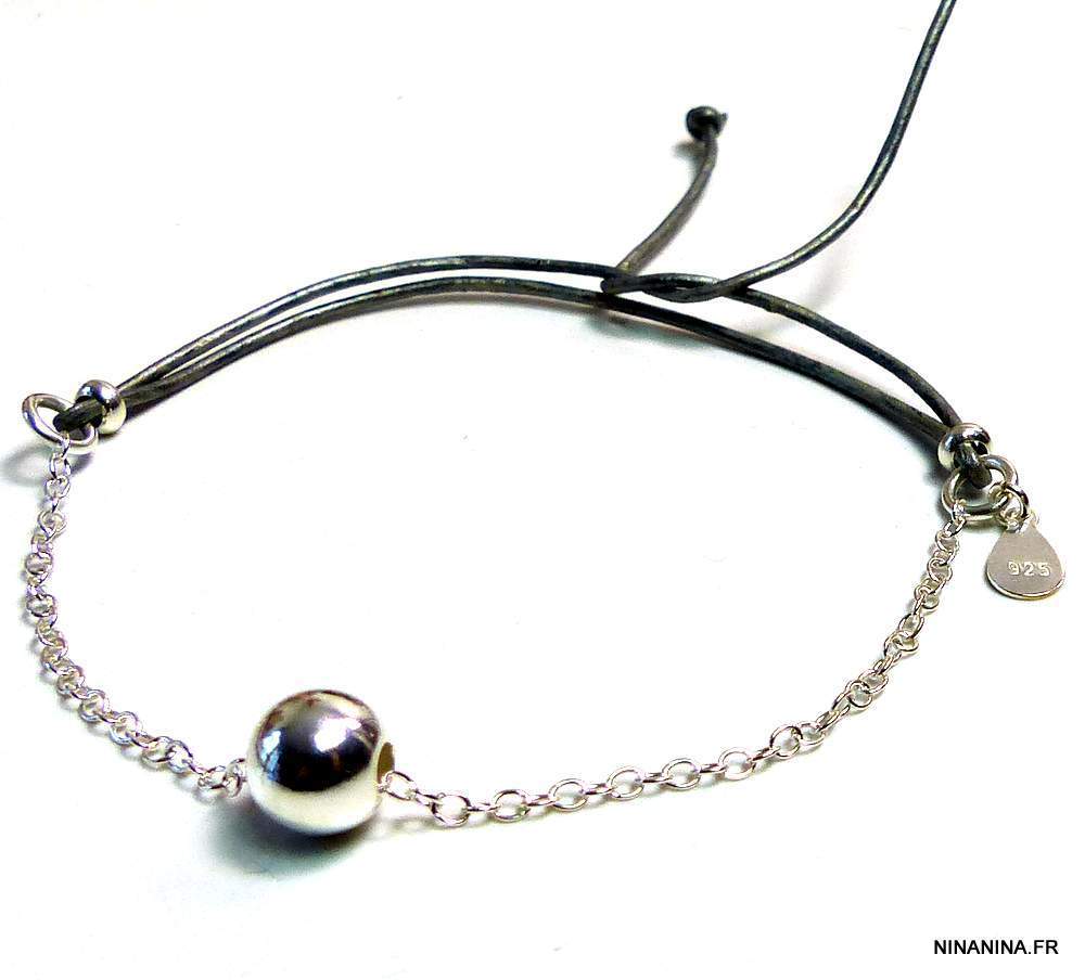 Bracelet cordon cuir perle argent massif constitué d’une perle ronde en argent 925 montée sur chainette en argent 925 et cordon en cuir gris (1 mm de diamètre). Diamètre de la perle : 8 mm. Diamètre : 5 cm env réglable. Fermeture par un noeud Livré dans sa pochette d’organza. Bijou 100% fait-main