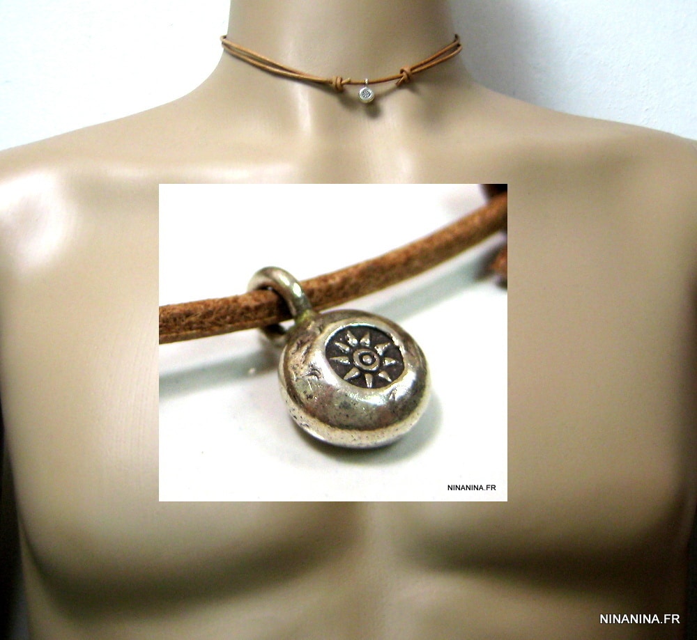 Collier cordon cuir tribal pendentif rond Argent 925 massif composé d’un pendentif rond ciselé en argent 925 monté sur cordon de cuir noir (2mm de diamètre).