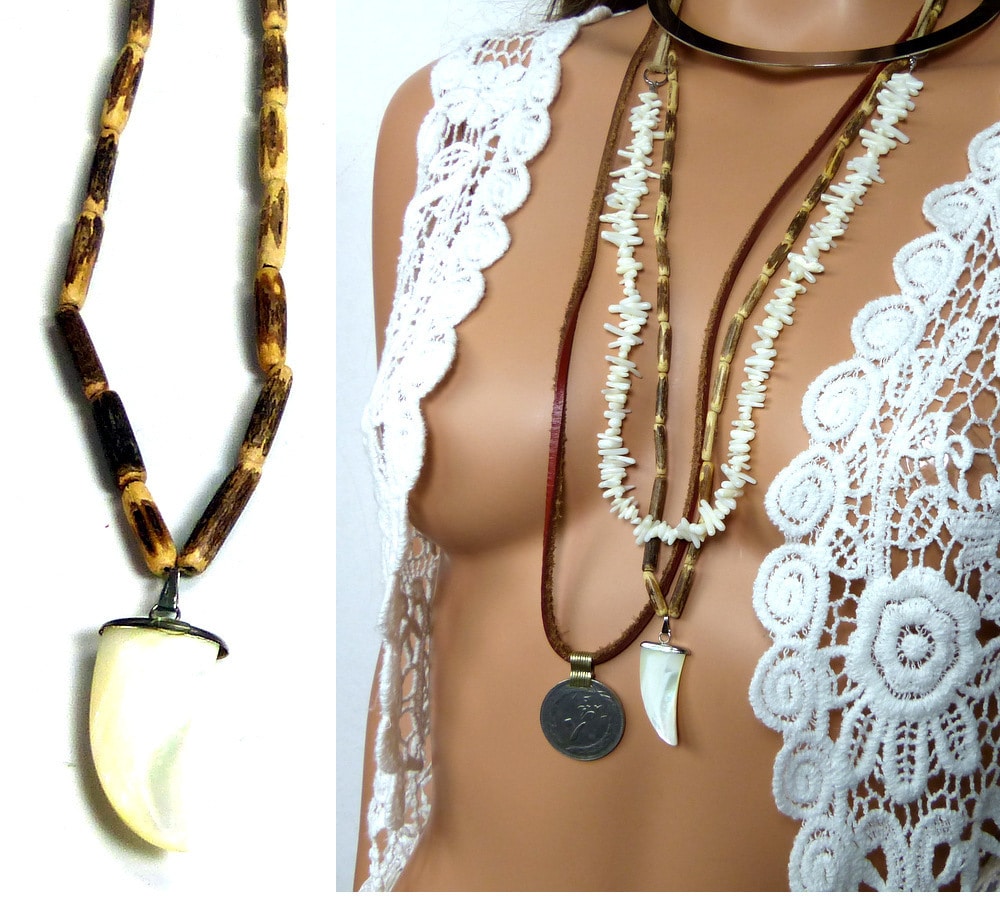 Collier sautoir perles bois tribal dent de requin nacre composé d’un pendentif dent de requin en nacre et de perles de bois cylindriques. Dim du pendentif : 3 x 1,5 cm. Fermoir aimanté cylindrique. Longueur (fermoir compris) : 75 cm env. Livré dans sa pochette d’organza. Bijou 100% fait-main.