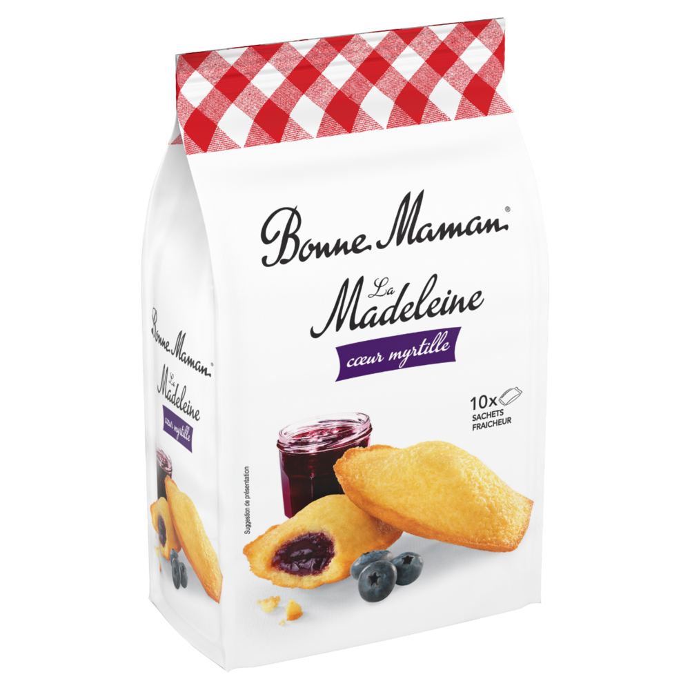 Farine de BLE tendre, sucre, OEUFS 17%, sirop de sucre inverti, purée de myrtilles 10%, BEURRE, huile de colza, stabilisant : glycérol, arômes naturels de vanille (contient alcool) et de myrtille, poudres à lever : carbonates et citrates de sodium (BLE), jus de citron concentré, sel, gélifiant : pectines, correcteur d’acidité : citrates de sodium.