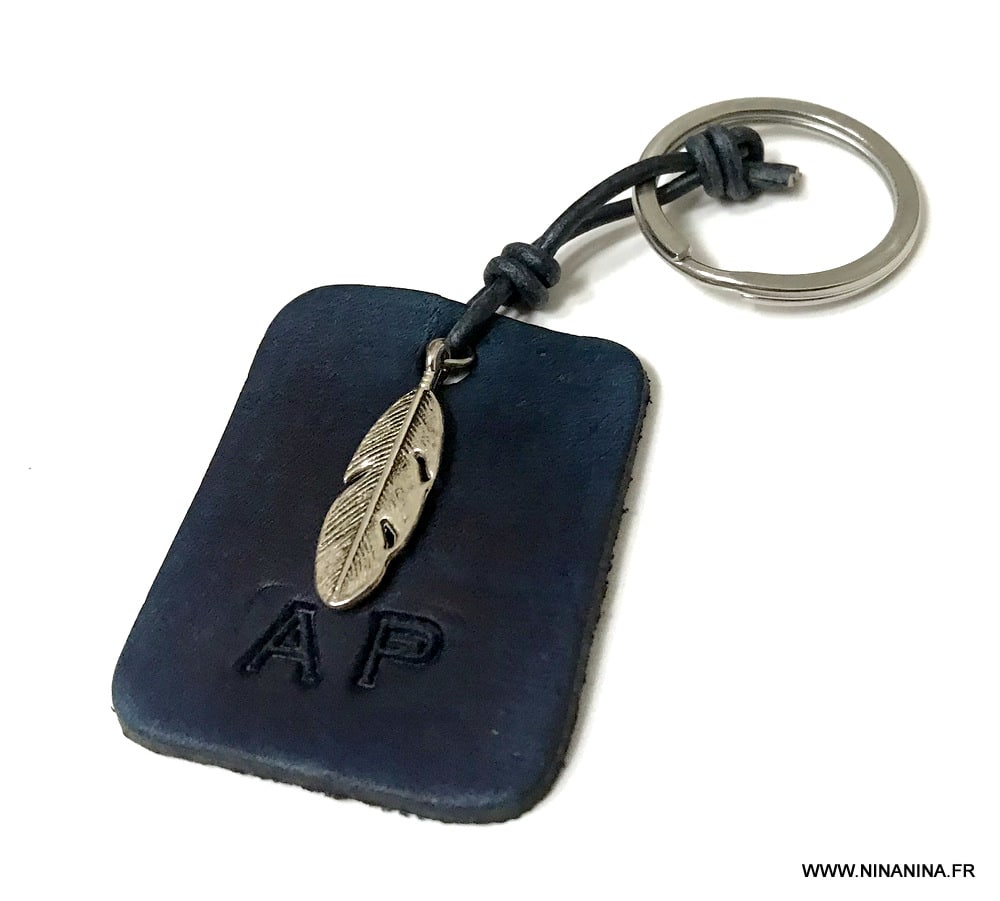 Porte clé plume cuir personnalisé pour homme martelé et teint à la main composé d’un pendentif rectangulaire en cuir marron chocolat et d’un pendentif plume en métal argenté montés sur un anneau de porte-clé en acier inoxydable.